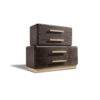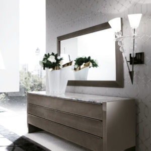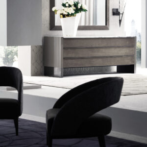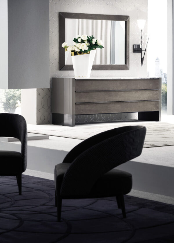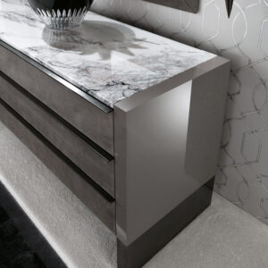 Dresser in high gloss polyester grey lacquer with marble top. 3 full extension double drawers with fronts in natural protected nubuk leather, bottom part in velvet fabric. Base, legs and handles in black nickel steel.