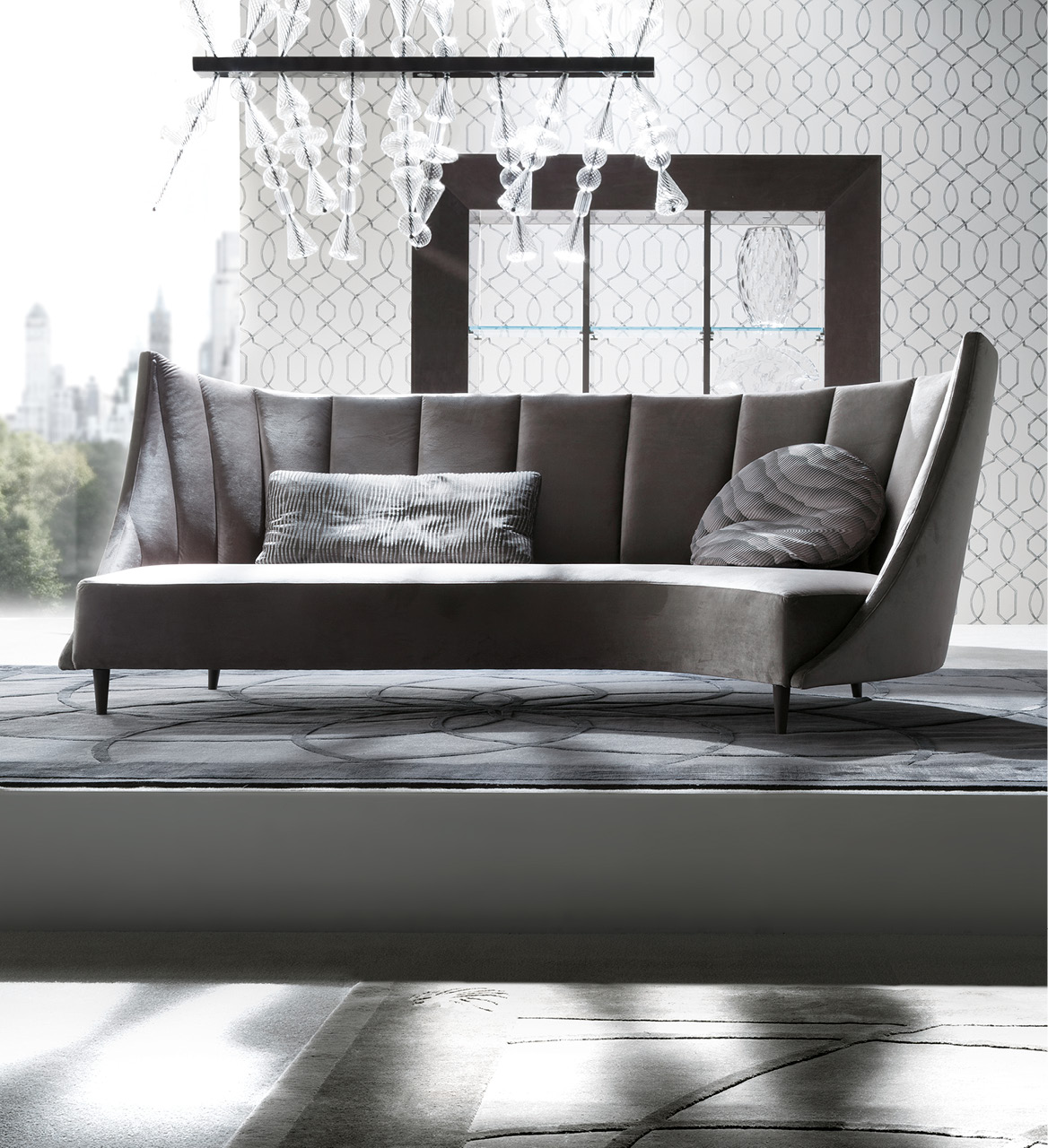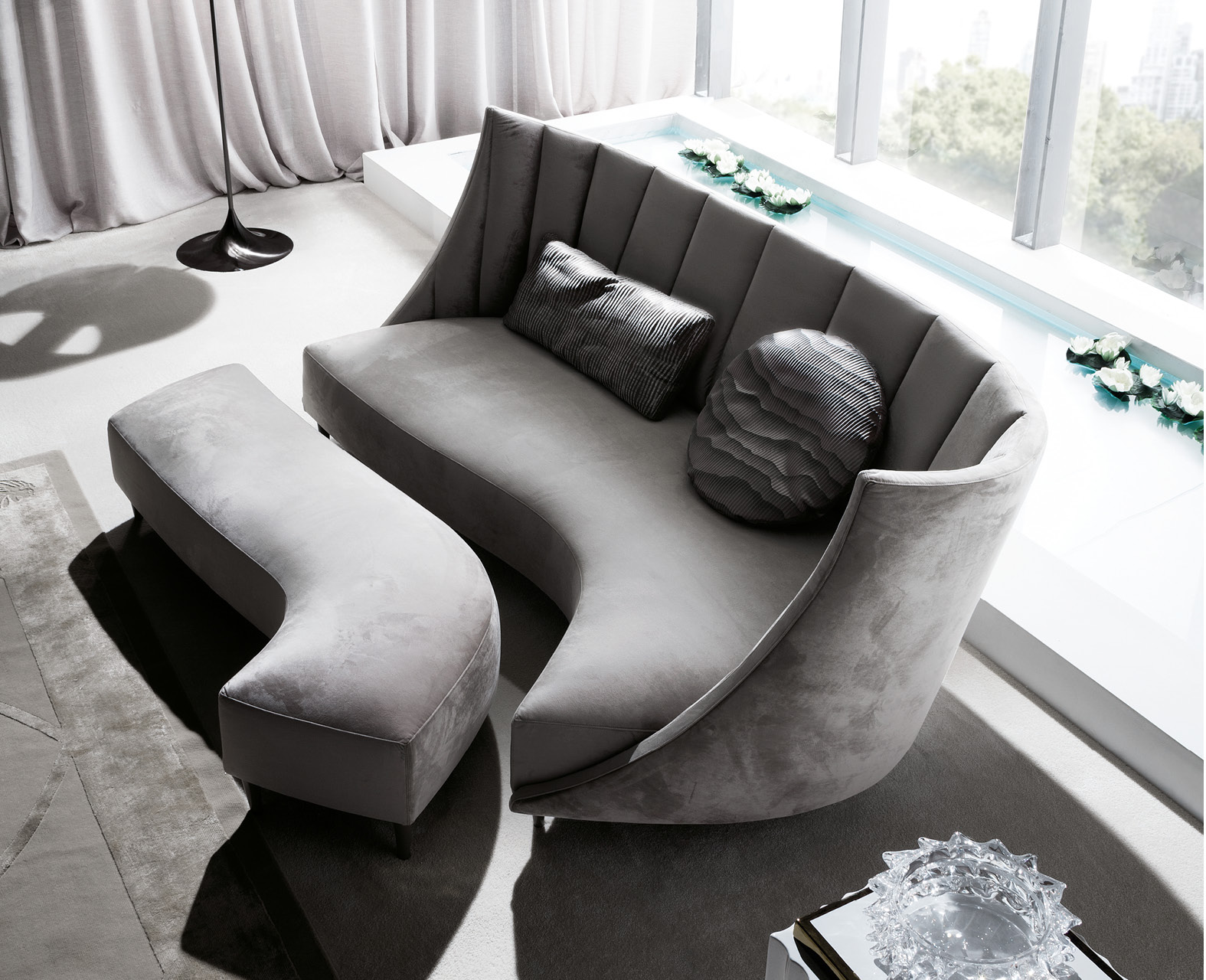 Sofa 3 seats available in first grade leather, nubuk leather, lizard printed leather, velvet or suede fabric. Seat in polyurethane foam wrapped in down feather, 3 back pillows 100% down filling. Black nickel steel feet. Available left facing or right facing.