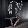 The Westin is a statement console table featuring an angular base in a choice of embossed or brushed lacquered steel finishes, including a mixed finish. This is complemented with a choice of ceramic top with 5cm-thick rounded wooden edges that can be finished in either brushed grey or brushed bronze lacquer.