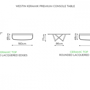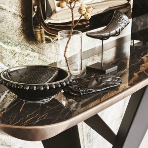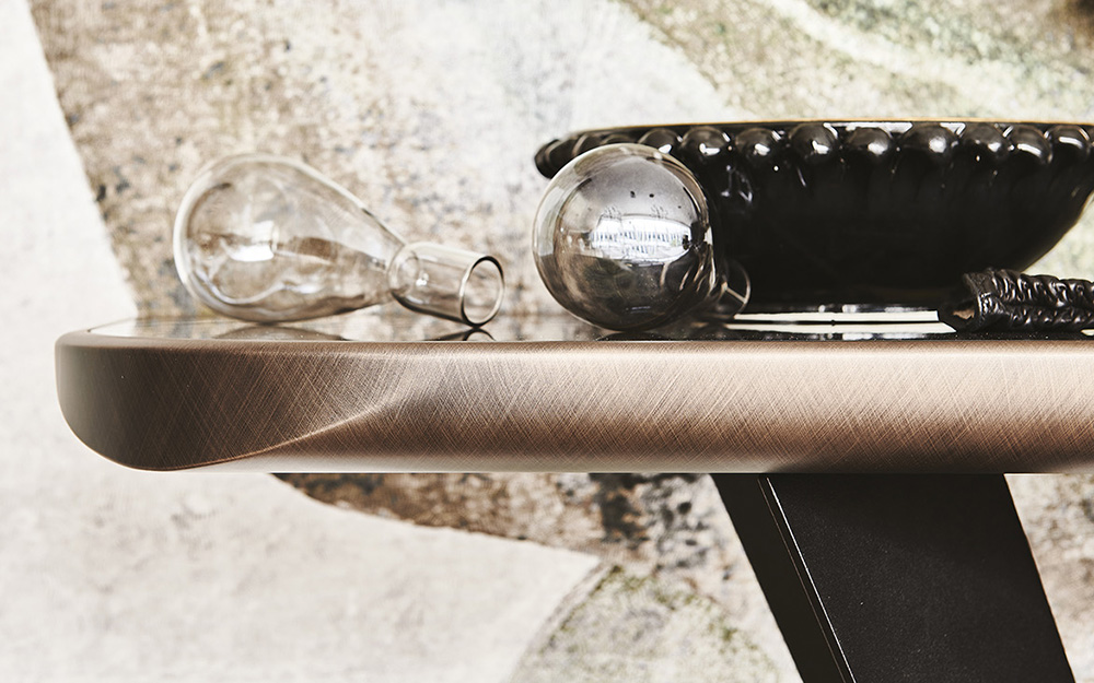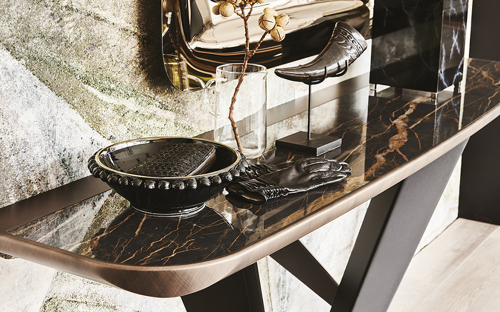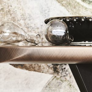 The Westin is a statement console table featuring an angular base in a choice of embossed or brushed lacquered steel finishes, including a mixed finish. This is complemented with a choice of ceramic top with 5cm-thick rounded wooden edges that can be finished in either brushed grey or brushed bronze lacquer.