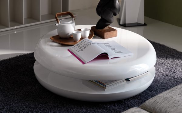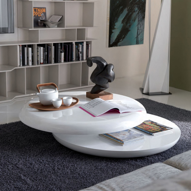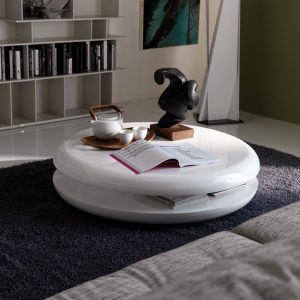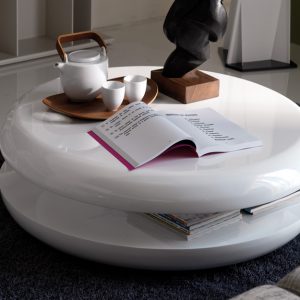 The Yo-yo by Cattelan Italia is a contemporary circular disc-shaped coffee table with a swivelling top available in Glossy White lacquered wood.