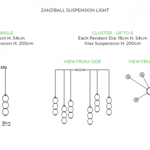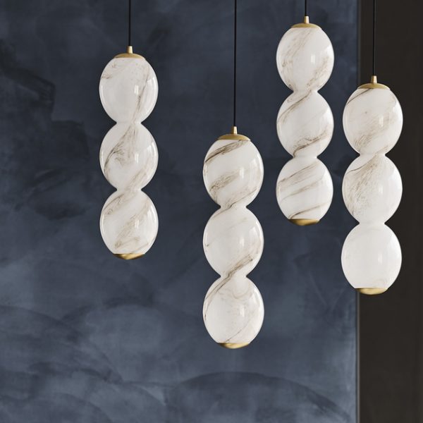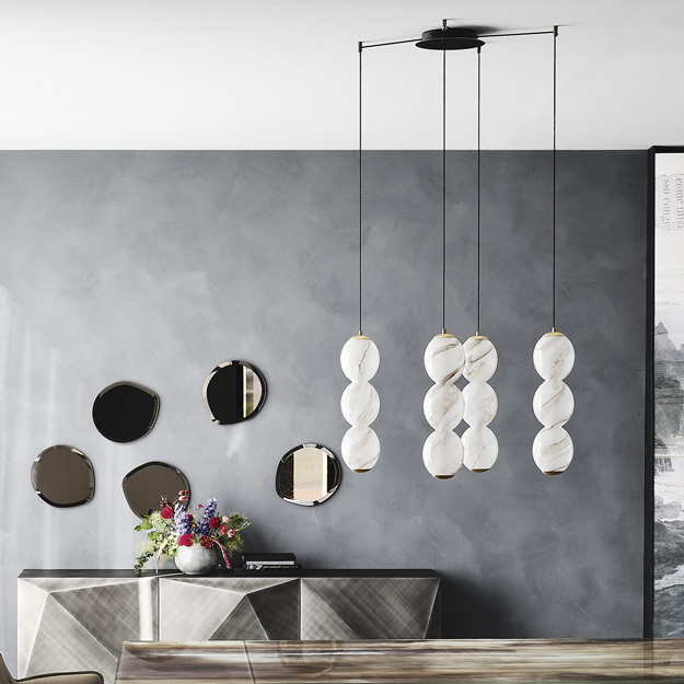 Elegant and unique, the Zanziball Suspension Cluster by Cattelan Italia features pearl bead-like shapes of blown glass in white with brass-toned marbling, with brushed brass details to the top and bottom ends, suspended from a black chrome ceiling plate. Select from a single pendant or group in a cluster of up to 6 for a stylish focal point.