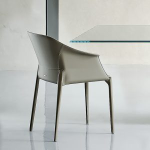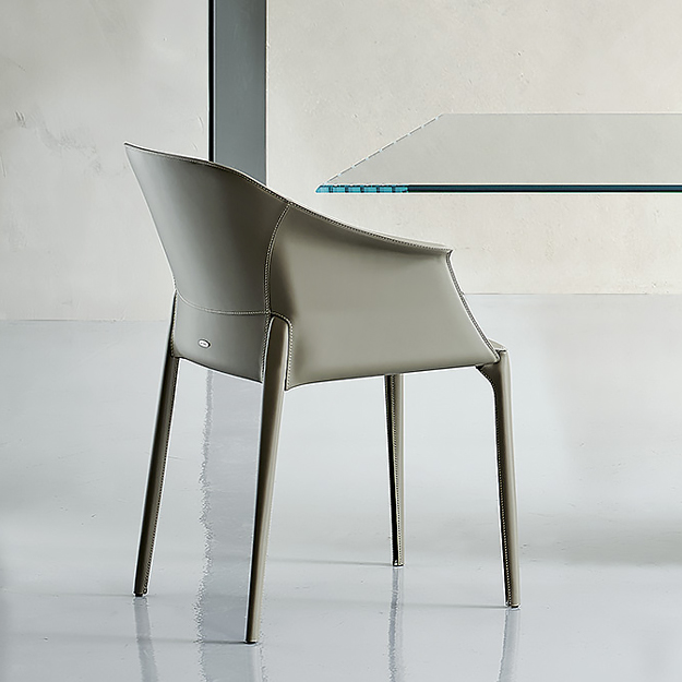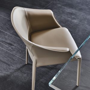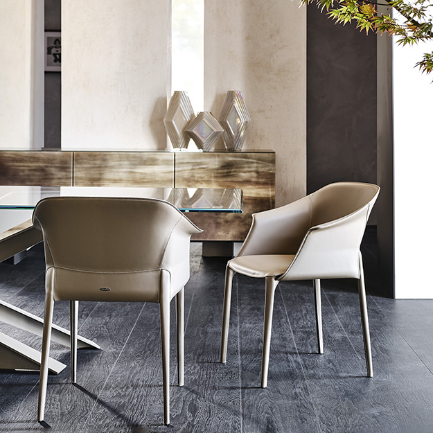 The Zuleika chair by Cattelan Italia is elegant in design, featuring a curvaceous backrest that slopes into the armrests enveloping the seat. This is complemented with upholstered steel legs. Choose from a selection of hide leather finishes, with a choice of stitch colour.